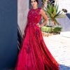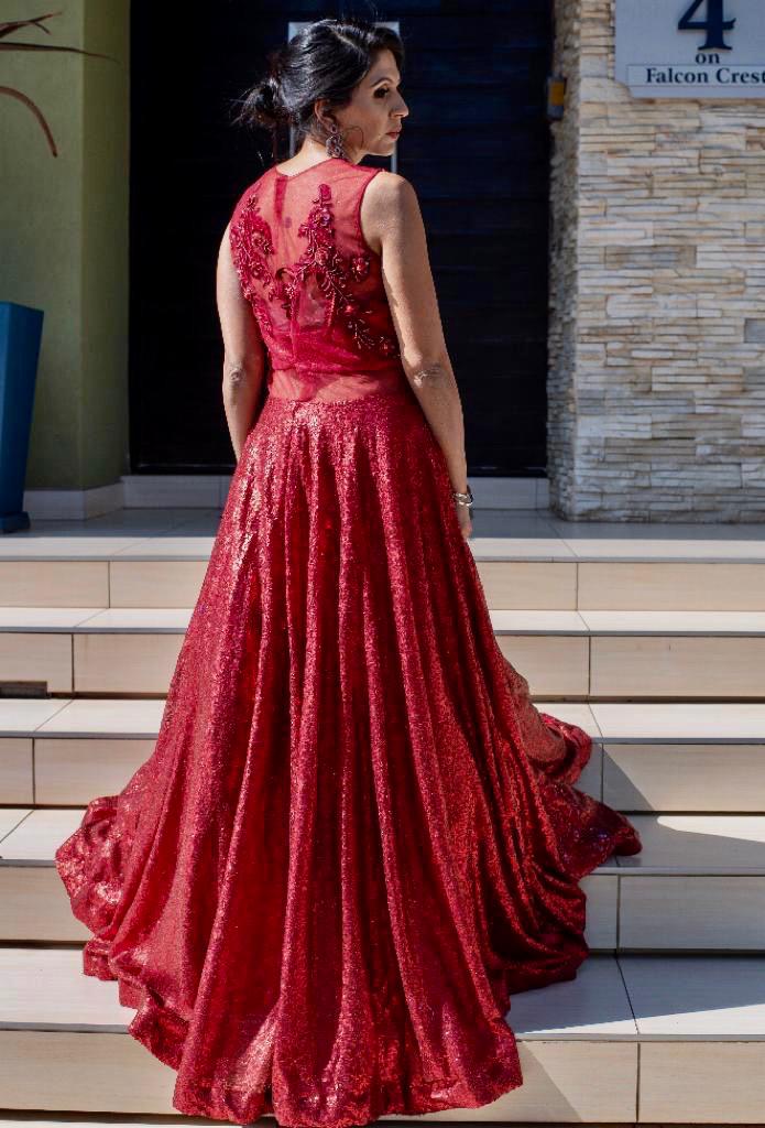 Sequence fabric gown with pearl work on the bodice.