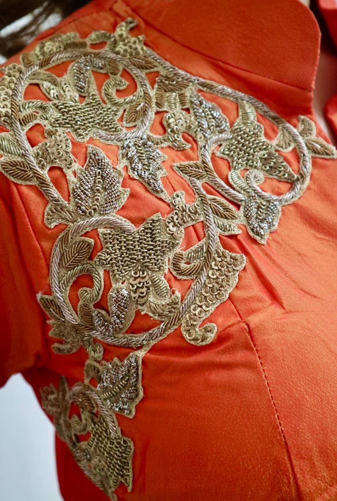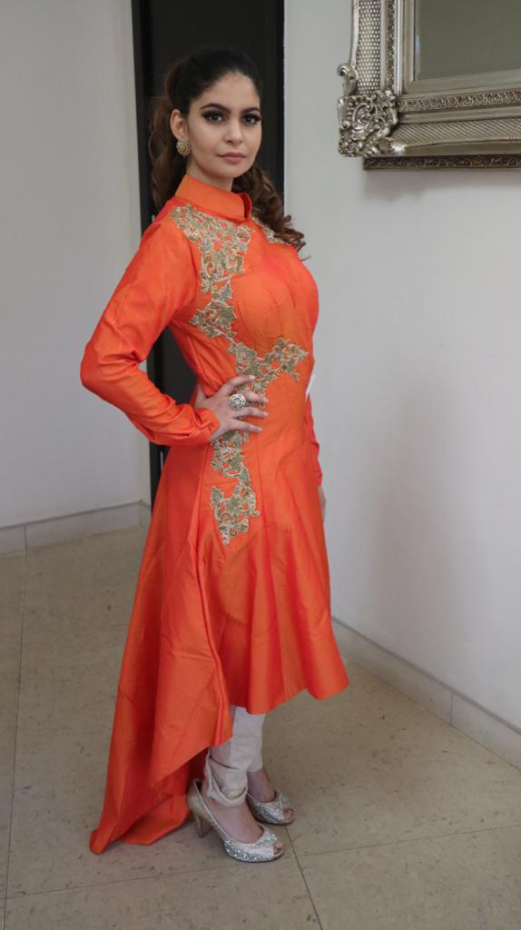 High n low jacket with zardozi handwork On the shoulder and beige jute cigarette pants.