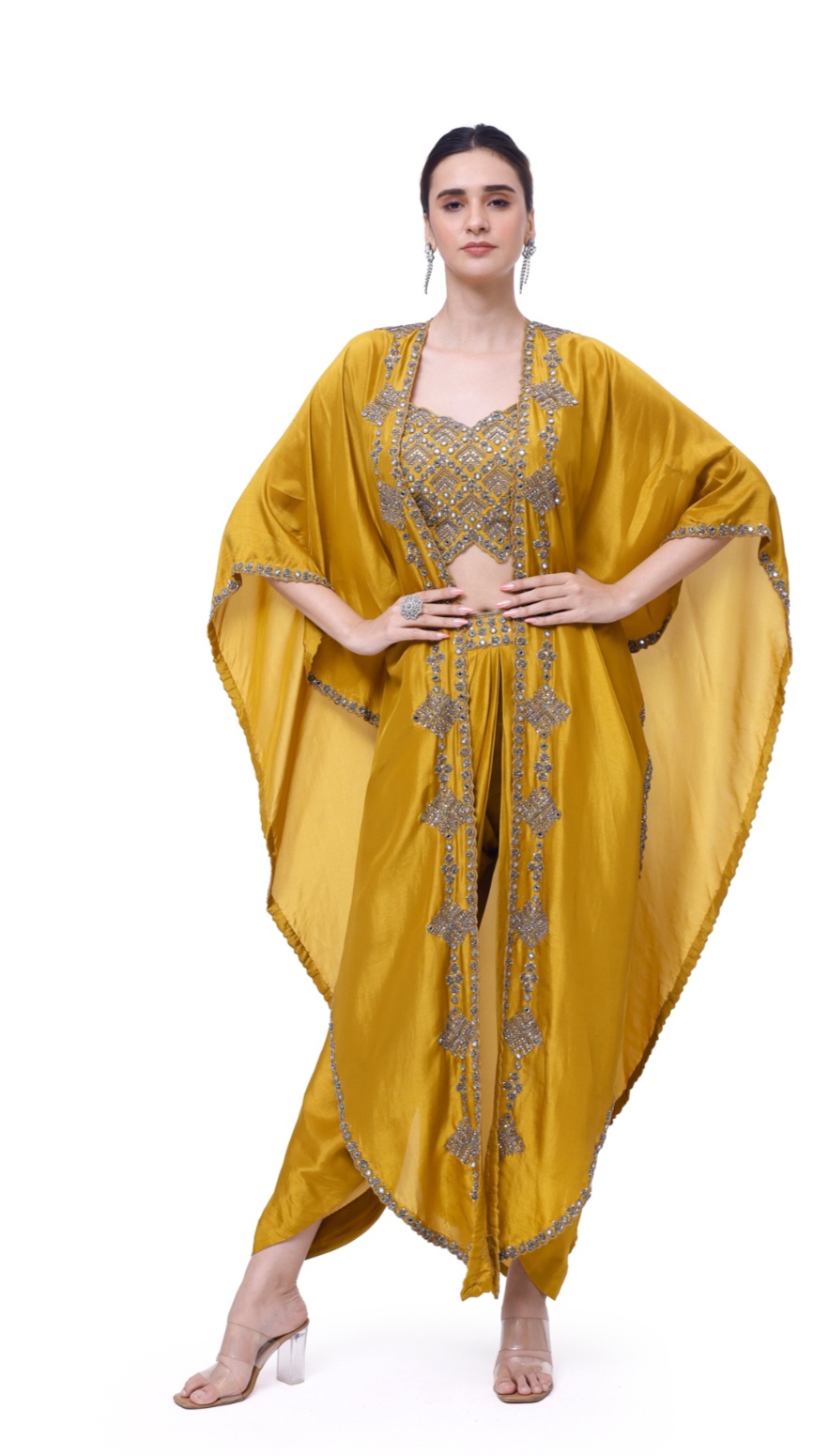 Mustard zardozi work bustier and tulips pant with kaftan style cape quantity