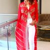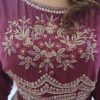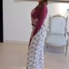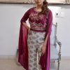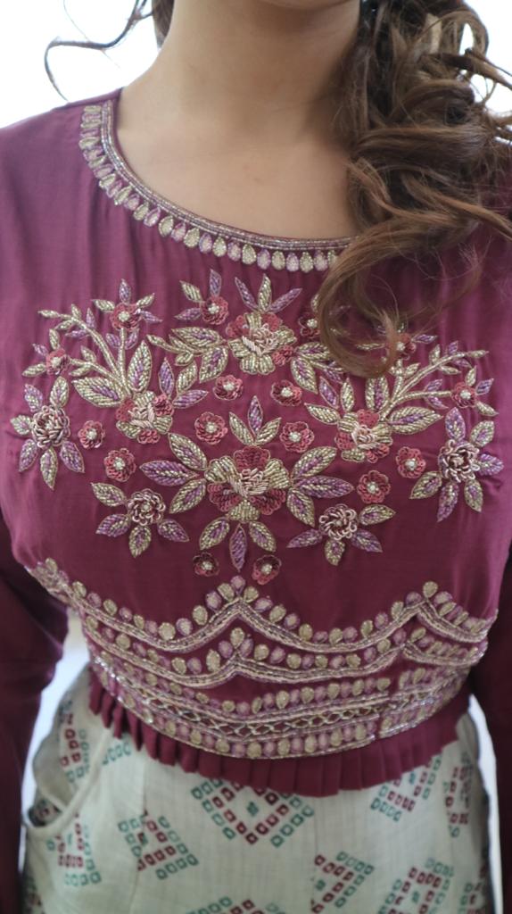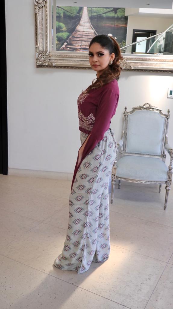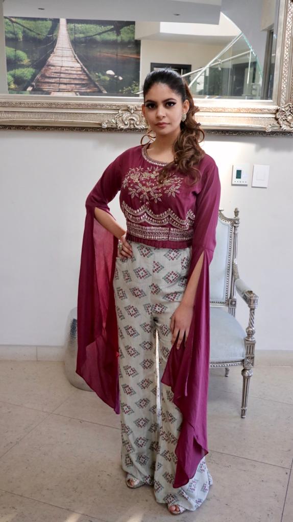 Printed broad pants with handwork on magenta color top & exaggerated sleeves.